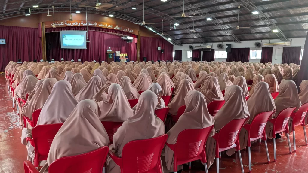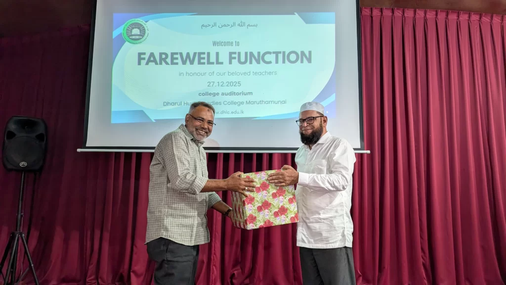 கல்லூரியில் ஆசிரியராக கடமையாற்றி தமது சேவை காலத்தை கல்லூரி மாணவர்களுக்காக அர்ப்பணம் செய்த கல்லூரியின் விரிவுரையாளர்களான எமது ஆங்கில பாட ஆசிரியர் SINNA LEBBAI ANVER KHAN (B.A, M.A, Dip in ENG, B.A in HL) அவர்களுக்கும் ,அரபு பாட ஆசிரியர்களான MOULAVIYA ABDUL MAJIDH FATHIMA ZEENA (B.A) மற்றும் MOULAVIYA ABDUL RAUF FATHIMA SUJA ( HUDHAYIYYA, (B.A))அவர்களுக்கும் கல்லூரியின் நூலகரான ,ஆசிரியை MOULAVIYA MOHAMED KALEEL MUZNA (HUDHAYIYYA, B.A(Hons))ஆகியோருக்குமான பிரியாவிடை நிகழ்வு கல்லூரியின் நிர்வாகம், விரிவுரையாளர்கள் மற்றும் மாணவர்களால் 27.12.2025 ஆம் திகதி சனிக்கிழமை, கல்லூரியின் கேட்போர் கூடத்தில் பிற்பகல் 12.30 மணியளவில் ஏற்பாடு செய்யப்பட்டது.