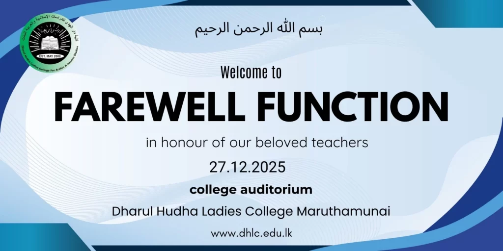 கல்லூரியில் ஆசிரியராக கடமையாற்றி தமது சேவை காலத்தை கல்லூரி மாணவர்களுக்காக அர்ப்பணம் செய்த கல்லூரியின் விரிவுரையாளர்களான எமது ஆங்கில பாட ஆசிரியர் SINNA LEBBAI ANVER KHAN (B.A, M.A, Dip in ENG, B.A in HL) அவர்களுக்கும் ,அரபு பாட ஆசிரியர்களான MOULAVIYA ABDUL MAJIDH FATHIMA ZEENA (B.A) மற்றும் MOULAVIYA ABDUL RAUF FATHIMA SUJA ( HUDHAYIYYA, (B.A))அவர்களுக்கும் கல்லூரியின் நூலகரான ,ஆசிரியை MOULAVIYA MOHAMED KALEEL MUZNA (HUDHAYIYYA, B.A(Hons))ஆகியோருக்குமான பிரியாவிடை நிகழ்வு கல்லூரியின் நிர்வாகம், விரிவுரையாளர்கள் மற்றும் மாணவர்களால் 27.12.2025 ஆம் திகதி சனிக்கிழமை, கல்லூரியின் கேட்போர் கூடத்தில் பிற்பகல் 12.30 மணியளவில் ஏற்பாடு செய்யப்பட்டது.