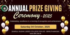 2024/2025 கல்வி ஆண்டிற்கான வருடாந்த பரிசளிப்பு விழா 04.10.2025 சனிக்கிழமை காலை 10.45 மணியளவில் தாருல் ஹுதா அரபு மற்றும் இஸ்லாமிய கற்கைகள் மகளிர் கல்லூரியின் கேட்போர் கூடத்தில் இடம்பெற்றது. இந் நிகழ்வின் விஷேட