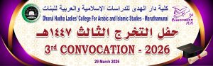 தாருல் ஹுதா அரபு மற்றும் இஸ்லாமியக் கற்கைகளுக்கான மகளிர் கல்லூரியின் 3வது பட்டமளிப்பு நிகழ்வு 2026 மார்ச் 29 ஆம் தேதி (ஞாயிற்றுக்கிழமை) காலை 9.30 மணிக்கு கல்லூரியின் கேட்போர் கூடத்தில் மிகுந்த சிறப்புடனும்